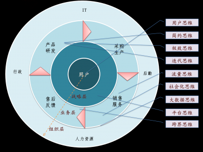 不是因为有了互联网,才有了互联网思维,也不是只有互联网公司才有互联网思维。真正的互联网思维是对传统企业价值链的重新审视,体现在战略、业务和组织三个层面,以及供研产销的各个价值链条环节中。并且将传统商业的“价值链”,改造成了互联网时代的“价值环”。