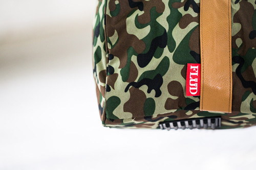 该系列采用尼龙以及单宁面料打造,其中一款选用了当下火热的迷彩图案满版印制,另外两款则是分别采用 4 oz 的黑色和蓝色单宁布,均以棕色皮革作细节点缀,红色的 FLUD 标签辨识度极高。值得一提是,旅行袋内部设有三个拉链口袋,旨在外出旅游时能为鞋款提供最大保护。