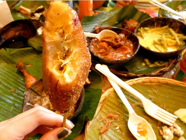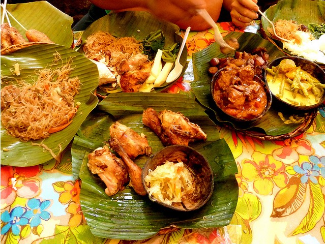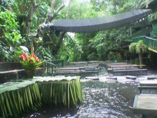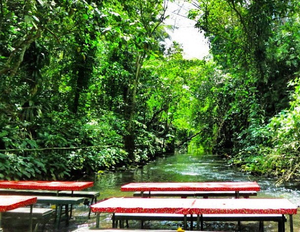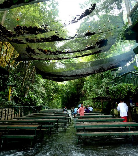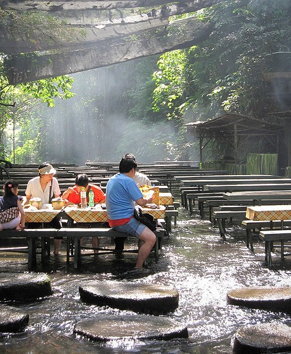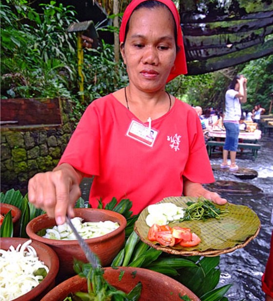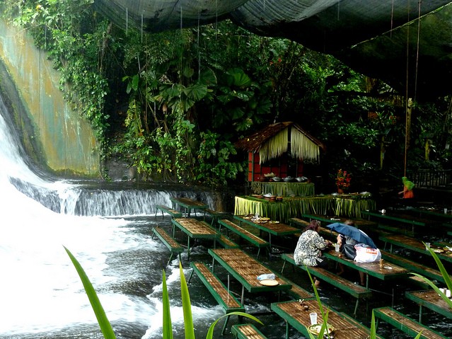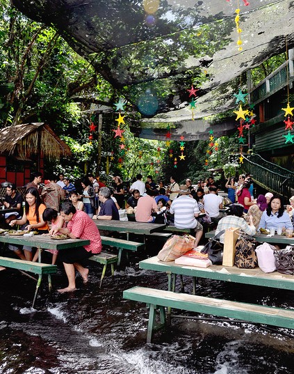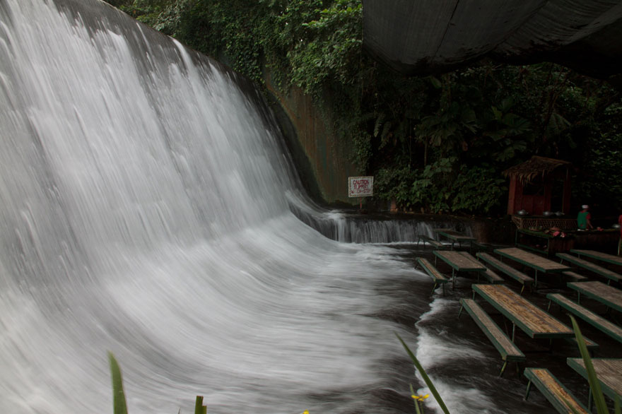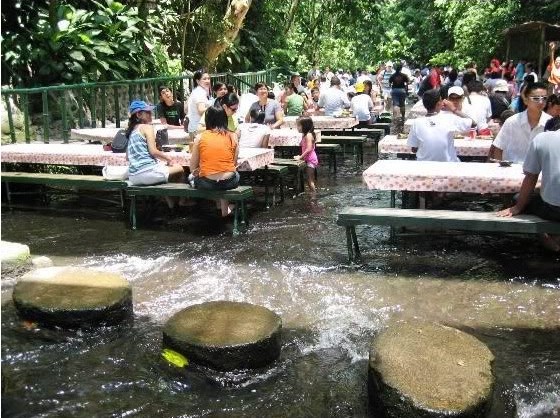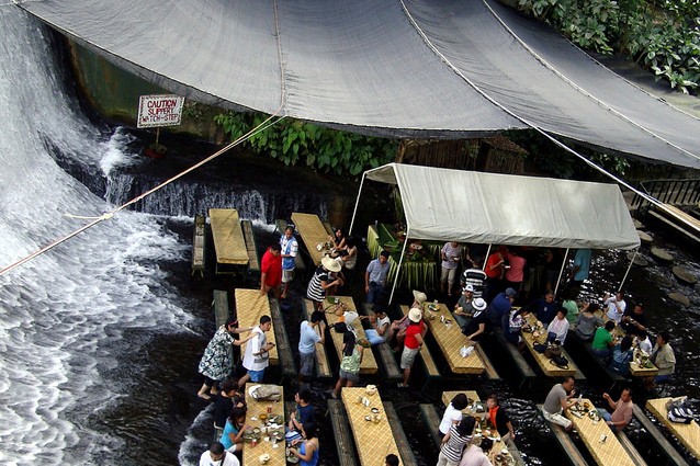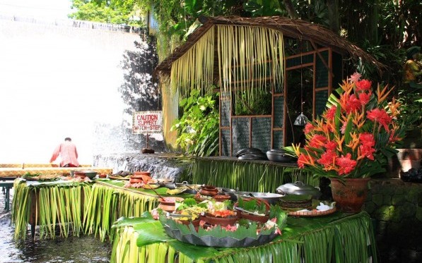 菲律宾Villa Escudero瀑布餐厅是一家不但可享受大自然也有着好气氛的的野外餐厅。Villa Escudero是菲律宾知名的植物园及旅游胜地。瀑布从坝上滚滚而下,野餐的地方就在瀑布流过的地方,桌子、凳子都放在水中,人要想吃饭也要脱鞋,光脚走进去。在水流中用椰子树的叶子做容器取食传统的菲律宾食品,用椰壳盛一碗汤,然后坐在水中的桌子旁,将双脚泡在流水中品尝美味。头顶上是透过树叶泄下的暖暖的阳光,脚下是凉凉的流水,中午的暑气顿时一扫而空。吃完了饭,身着民族服装的演员们就来招呼客人去看西班牙风格和当地传统文化表演了。