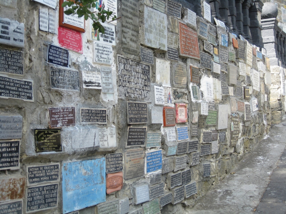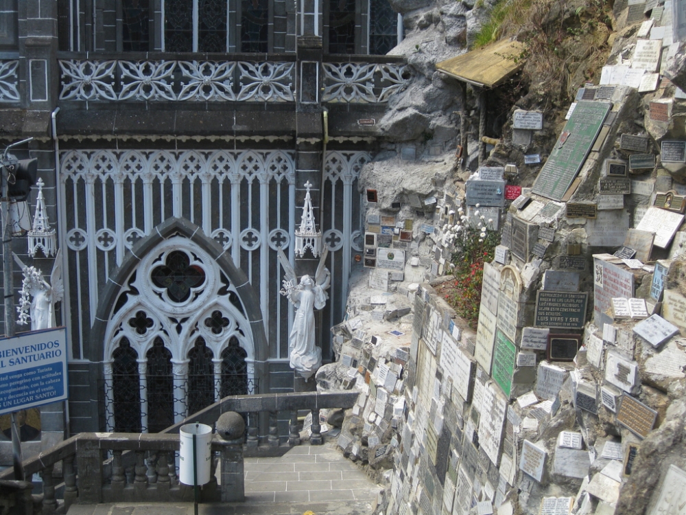 这座教堂倚着峡谷峭壁而建,是一座桥式建筑。横跨险峻峡谷的砖砌双孔拱桥,两端一边是那块带有圣母形象的巨石,它刚好成为主祭坛,另一边就是大教堂。Las Lajas是一座哥特式教堂,始建于1926年。因为这里是传说圣母玛利亚显灵的地方,年复一年来自哥伦比亚和世界各地的朝圣者来到这里,许多人在通向教堂的小路的崖壁上留下无以计数、各式各样的感恩祈祷牌。