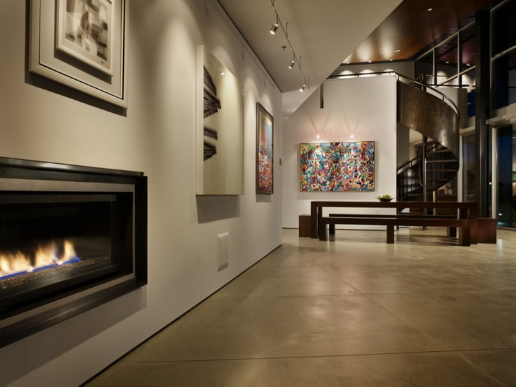 由建筑师Poteet设计,房间现代又舒适。空间是选择了非常高的天花板,增加裸露的横梁和通风管,这与现代风格的室内装饰很好的结合。选择了玻璃板围栏允许从大窗户的光不间断的流动在整个空间,一个小的上层阁楼结构增添了不少趣味。