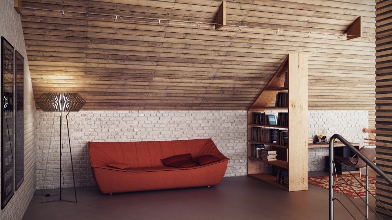 俄罗斯设计师Uglyanitsa Alexander所设计的一个开放式的空间,完整的原始的砖墙和管道诉说着一个迷人的色彩的故事。原始的空间被改造成一个舒适,温馨的内室,通过引入丰富的宝石色调的主截面沙发、靠垫,和铜管、橙色餐桌、吊灯灯罩、阁楼上的红色沙发呼应。