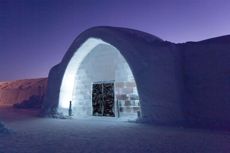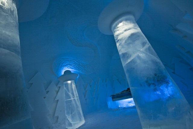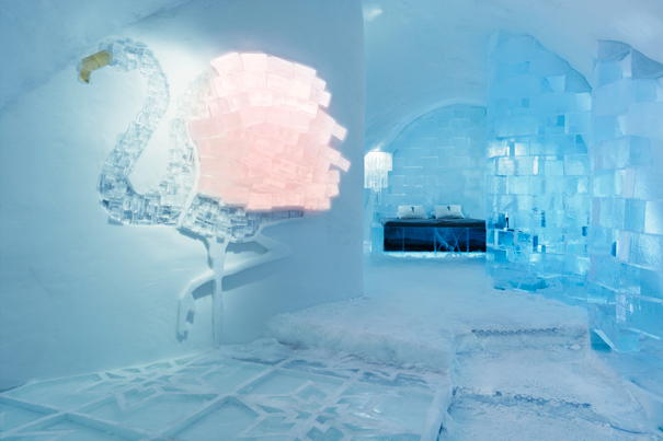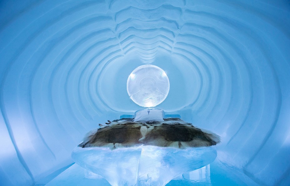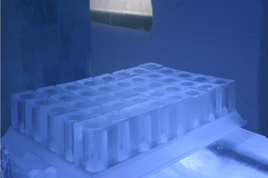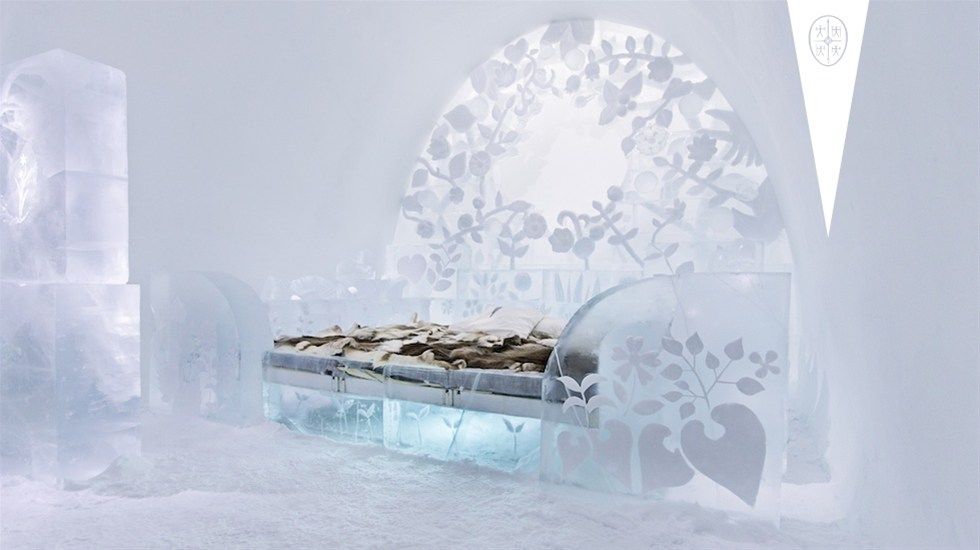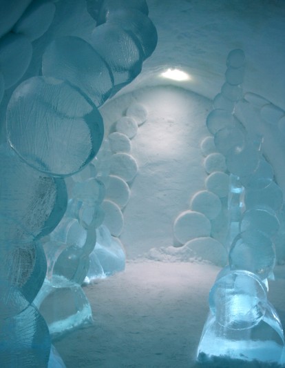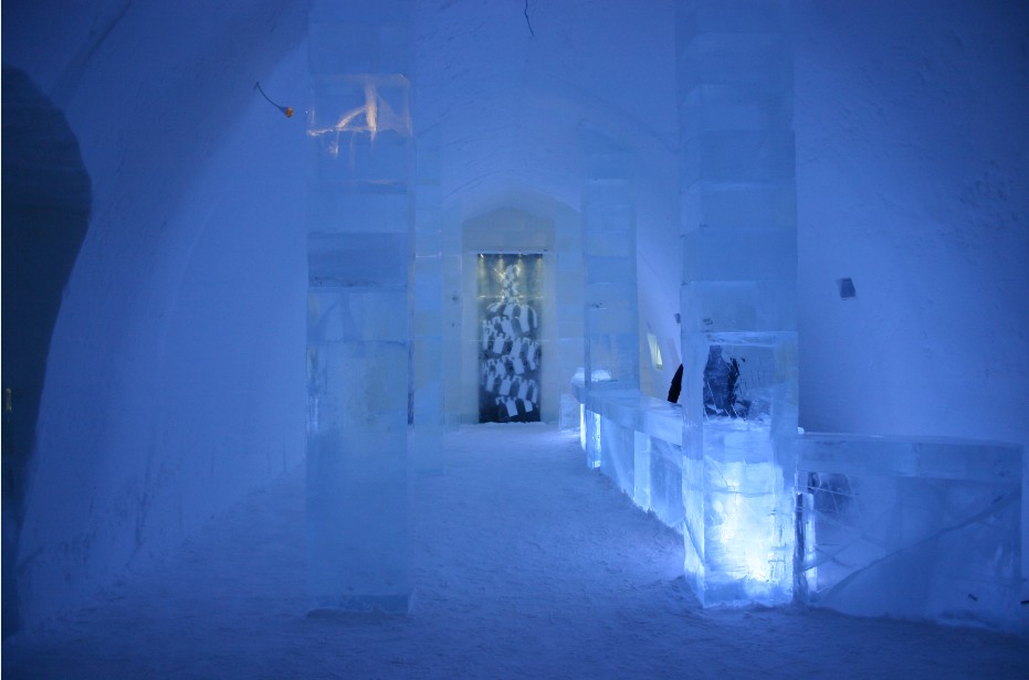 每年大约3月份左右,Icehotel 就把从Torne 河上采集的数以吨计的冰雪(通常是1 万吨冰块和3 万吨雪)储藏在附近的仓库里—冰块主要用于制作家具、冰雕装饰品和餐具、酒杯等,雪主要为了让建筑结构更牢固,而房间的结构也全是依赖冰块和雪,唯一能看到金属的地方是盥洗室。