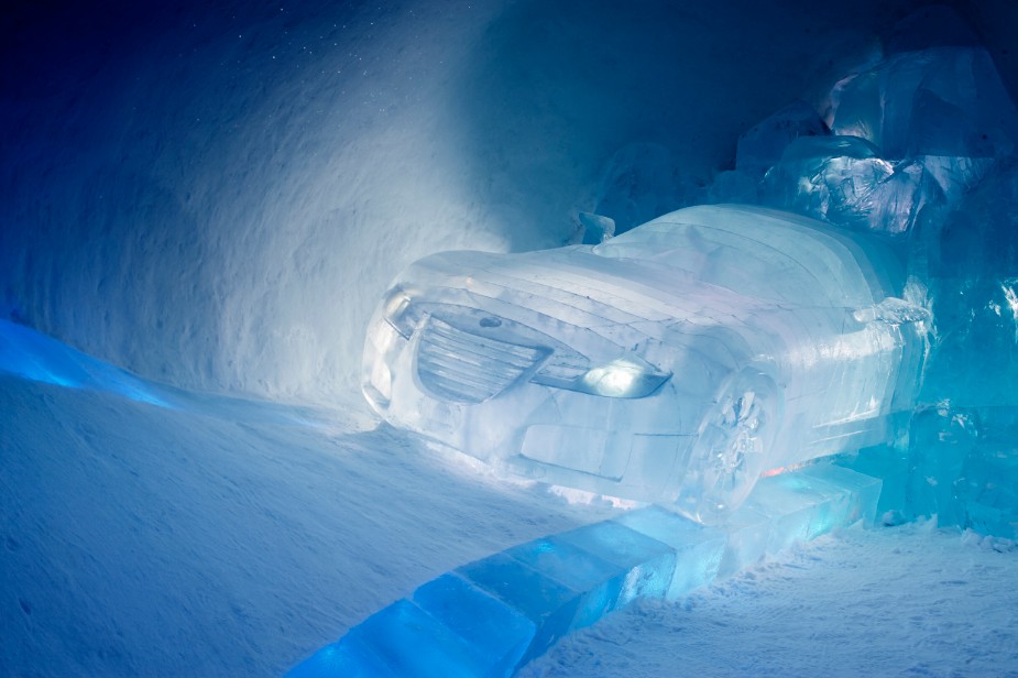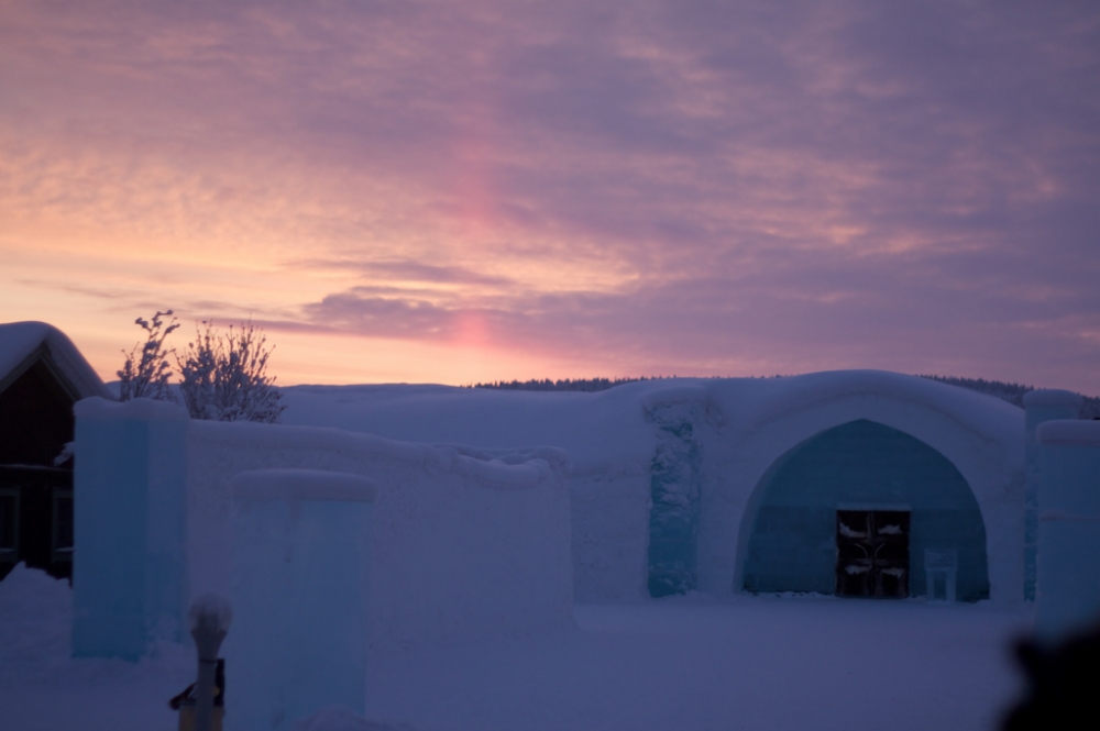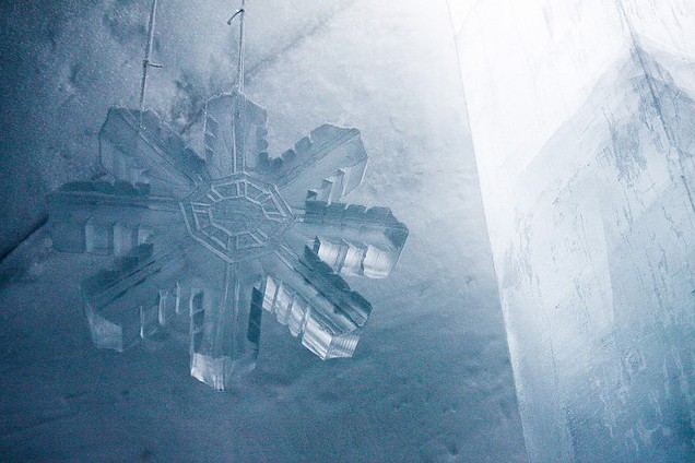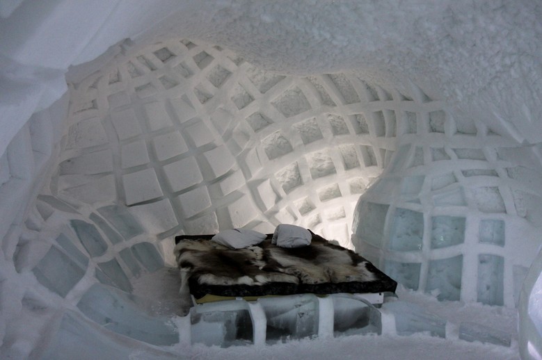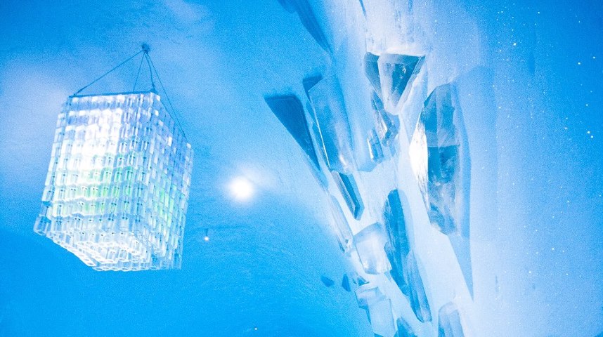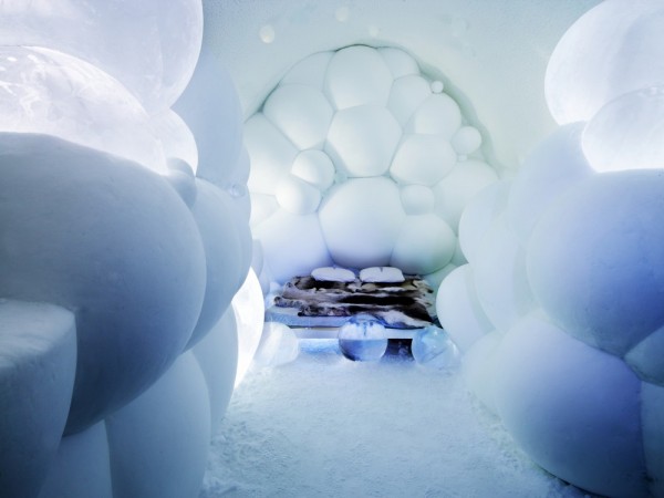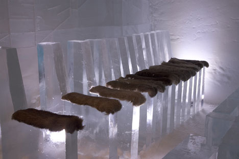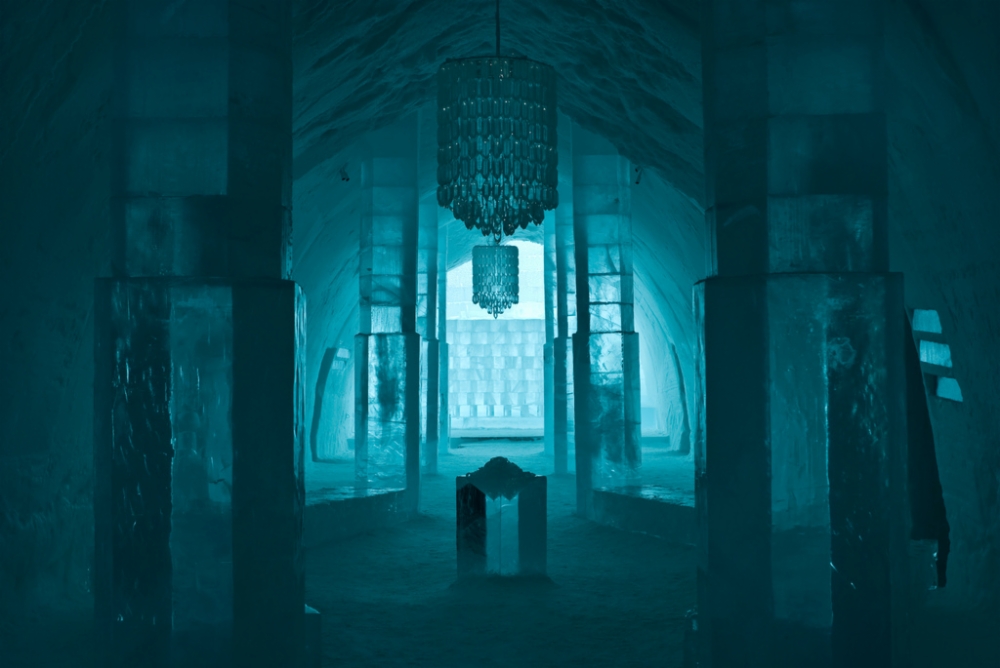 每年大约3月份左右,Icehotel 就把从Torne 河上采集的数以吨计的冰雪(通常是1 万吨冰块和3 万吨雪)储藏在附近的仓库里—冰块主要用于制作家具、冰雕装饰品和餐具、酒杯等,雪主要为了让建筑结构更牢固,而房间的结构也全是依赖冰块和雪,唯一能看到金属的地方是盥洗室。