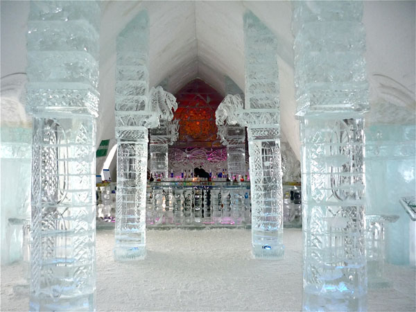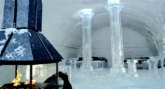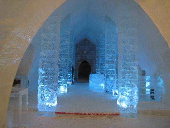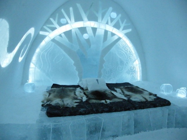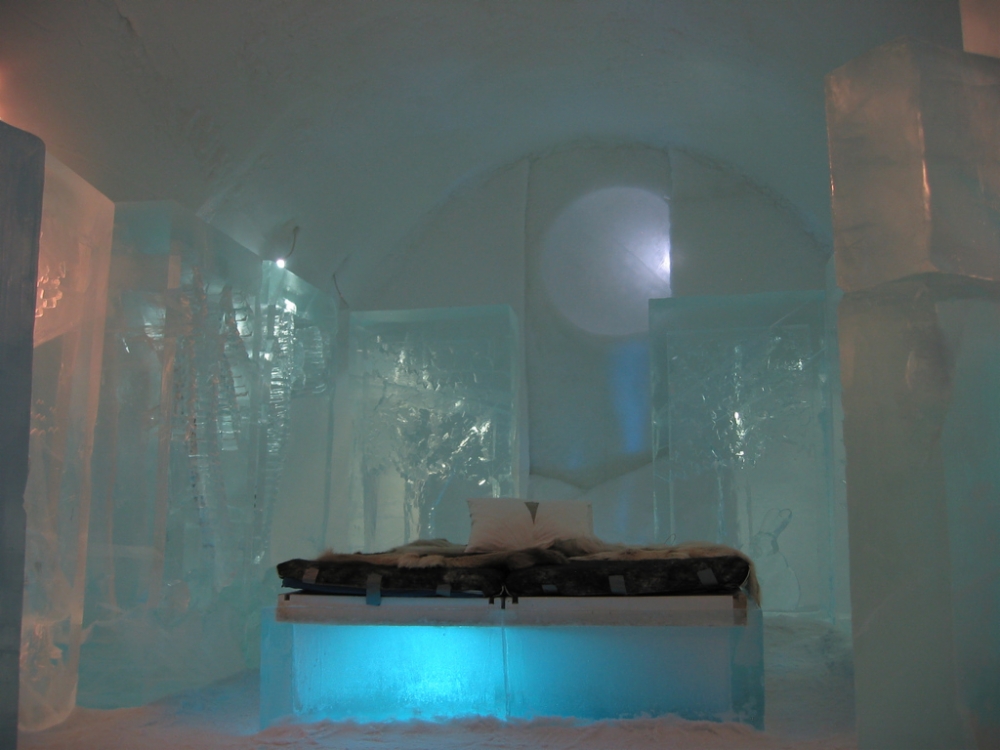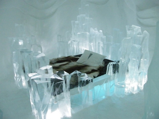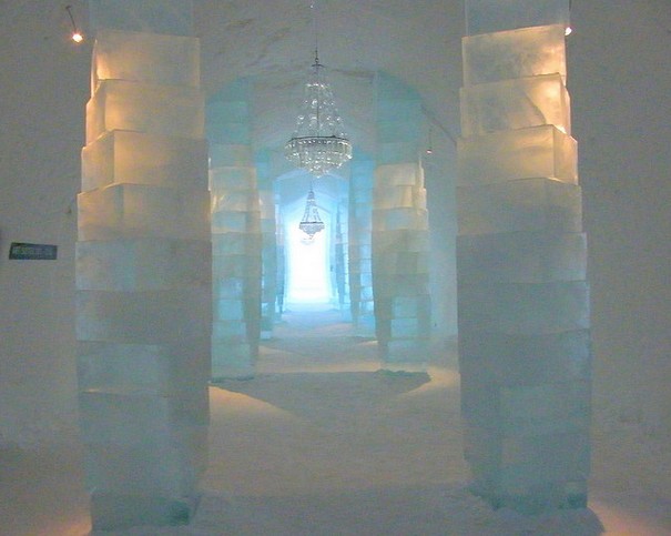 房间里没有浴室,也没有电视,只有一张冰床和一些由艺术家设计的冰雪雕塑。所有客房内的冰床都不是按照标准尺寸建造,床的造型也由受邀创作的艺术家根据房间的设计主题而定。酒店有冰制的豪华大厅,有巨形的餐 、座椅甚至火炉,全用厚厚的冰块制成。头顶的大吊灯是用极幼的丝线将一颗颗晶莹剔透的冰粒串成,再配以微弱的光纤灯光,比真正的水晶灯还要亮丽。