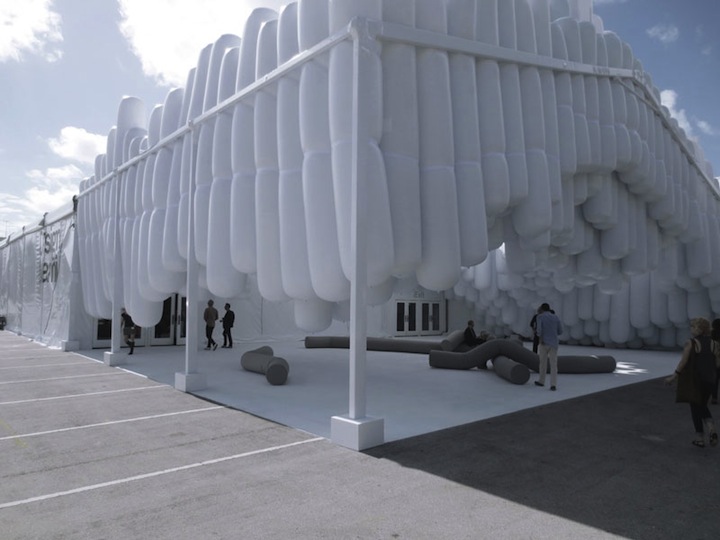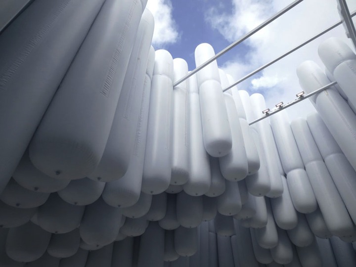 Snarkitecture这个建筑作品名为‘Drift’,漂浮之意。由五百个圆柱形的白色充气塑料管连接在一起,形成了一方独特的空间。