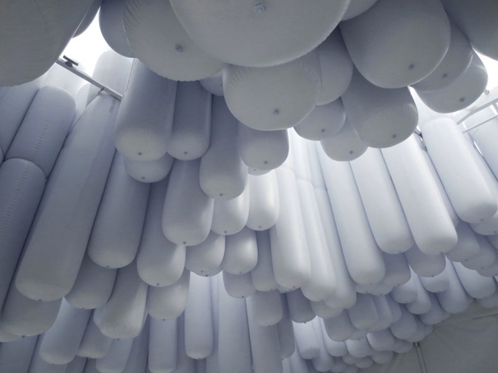 工作室设计师一直试图将设计物件以出乎意料的方式展示,并起到不同寻常的作用,工作室设计的项目普遍运用了这种创意概念,此外还将使用色彩和材料控制在一定范围内。项目实际上并未添加任何材料,圆管的塑胶材质与帐篷材质吻合,设计师只是改变了材料呈现的方式,创造出高低错落的充气圆管。