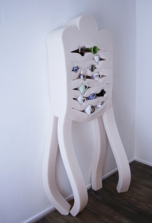 其实,这个创意产品是一个橱柜。柔软的橱柜利用橡胶海绵本身的柔软和可延展变形的特性,放进去的杯碟、书籍都被温柔地“呵护着”。尽管收纳的物品多而杂,但每样都一层一层地展现在眼前,一目了然。而这种烦恼只有靠柔软的橱柜来解决,它将各种物品予以收纳怀中,没有丝毫怨言。柔软的橱柜四只脚弯弯扭扭确实岌岌可危,清洁也是个难题。但设计师创造它意不在使用,而是想唤起人们对于这些不被关注的材料的重视和思考。而且这样简约化的厨房装修风格肯定会备受广大家庭青睐。