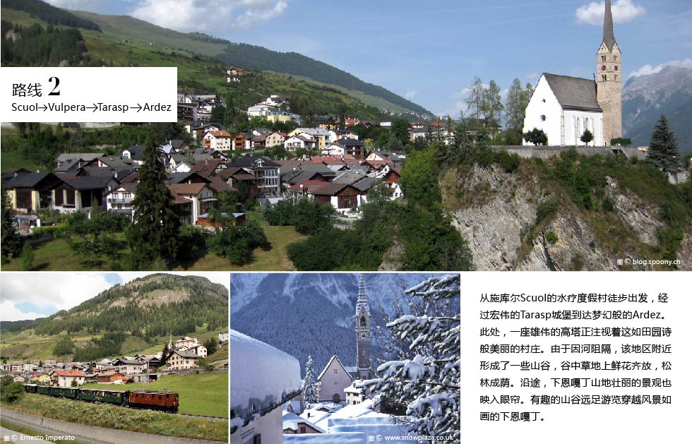 从施库尔Scuol的水疗度假村徒步出发,经过宏伟的Tarasp城堡到达梦幻般的Ardez。此处,一座雄伟的高塔正注视着这如田园诗般美丽的村庄。由于因河阻隔,该地区附近形成了一些山谷,谷中草地上鲜花齐放,松林成荫。沿途,下恩嘎丁山地壮丽的景观也映入眼帘。有趣的山谷远足游览穿越风景如画的下恩嘎丁。