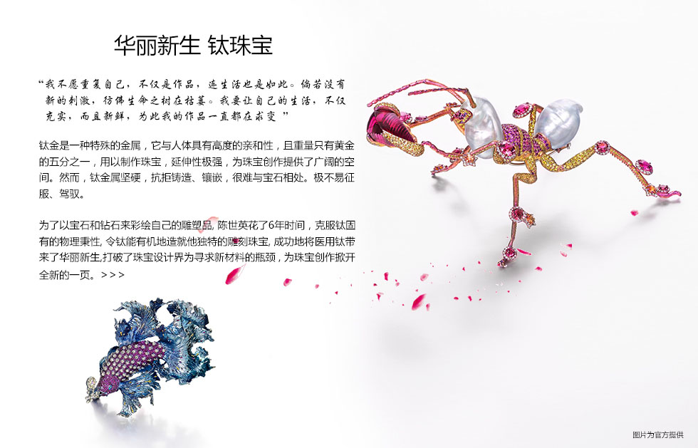 钛金是一种特殊的金属,它与人体具有高度的亲和性,且重量只有黄金的五分之一, 用以制作珠宝,延伸性极强,为珠宝创作提供了广阔的空间。然而,钛金属坚硬,抗拒铸造、镶嵌,很难与宝石相处。极不易征服、驾驭。为了以宝石和钻石来彩绘自己的雕塑品,陈世英花了6年时间,克服钛固有的物理秉性,令钛能有机地造就他独特的雕刻珠宝,成功地将医用钛带来了华丽新生,打破了珠宝设计界为寻求新材料的瓶颈,为珠宝创作掀开全新的一页。